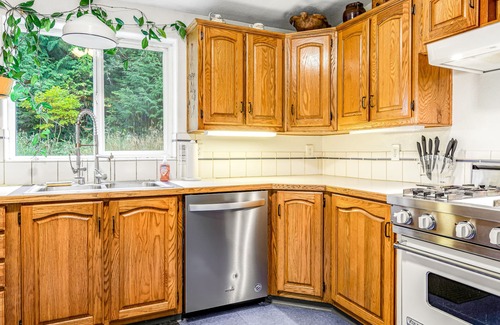 The inviting interior comes well-appointed for family-friendly comfort, with colorful decor and all the essentials of home. A fireplace and plush seating set the stage for cozy downtime in the living room, with a large collection of books and a TV hutch for casual entertainment. Find gourmet inspiration in the well-appointed full kitchen equipped with a deluxe suite of major appliances, including a Viking-brand gas range. Additional home essentials include central heating, free WiFi, and a private washer/dryer. This home captures the cultural spirit of Port Townsend, with colorful works by local artists.