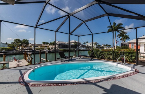 Classic water front Marco Island pool home 5 minutes to the Gulf of Mexico by boat. Walking distance to shops, restaurants and amenities. This classic home has been extensively remodeled with luxury and comfort in mind. Relax by the heated salt water pool while overlooking the water by your private dock, or stay inside and enjoy your 65" inch flat screen smart TV with WiFi. The master bedroom boasts a king size bed with private bathroom just remodeled, along with a 55'' smart TV. The other two rooms share a remodeled bathroom with one room having a queen size bed and the other one has two single beds. New granite counter tops and furniture along with new floors, beds, vanities, toilets, appliances and utensils. Kinda hard to find what hasn't been replaced. All other areas on Marco can be reached by walking, the two bicycles in the garage with helmets or a very reasonable cab ride. Not too much traffic on this dead end street to add to the calm and relaxing Marco Island charm. Beach cart, beach buggy, beach chairs, multiple coolers and an umbrella in the garage ready for the beach. There's also a Pac and Play, high chair, pool floats and 3 kids life vests. The best thing about being on the water is you just set back and forget about everything. Thanks for inquiring about my home.