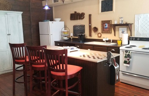 The Art Loft is an up-stairs private, airy and spacious early 20th century apartment overlooking Historic Downtown Clifton, Texas. This romantic space features high ceilings with rich red decor and original ship-lap walls to showcase original art work, books, comfortable furnishings and porch swing. A warm kitchen and shabby-chic bath with claw-footed tub complete the experience. Enjoy a view of Art Alley and being close to shopping and restaurants; it is a perfect getaway.