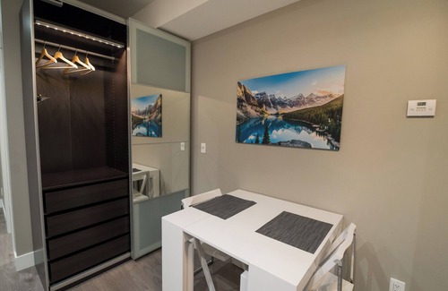 Walking distance to everything in downtown Kelowna! Centrally located in Kelowna's vibrant entertainment district. This modern studio condo is brand new, featuring a dedicated queen size bed that flips down from the wall (not a hide-a-bed or sofa bed!), air conditioning, wifi, reserved parking, and in-suite laundry. Guests have full use of common areas including the gym and large patio. Driving distance to over 40 wineries and Big White Ski Resort. Bright and sunny, with a mountain view!