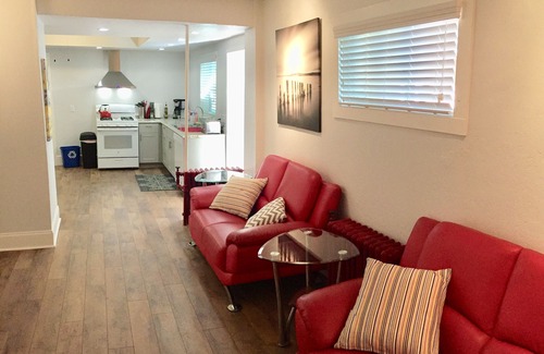 This single level space has 5 stairs leading from the parking area to the deck and entry. Guests have a private entrance with off street parking right out front.