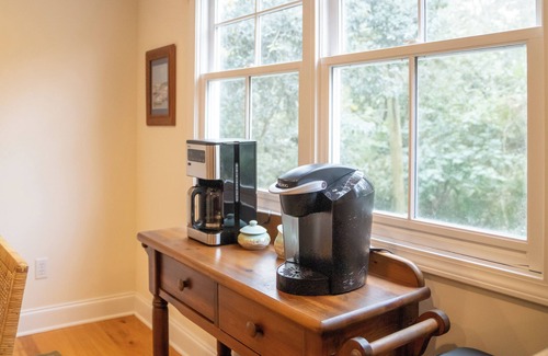 The modern kitchen is fully equipped with stainless steel appliances, including an electric oven/stove, microwave, refrigerator, toaster, and both a Keurig and full-size drip coffee maker. It’s stocked with all the utensils you need for cooking at home.