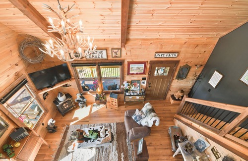 The Dreamcatcher Cabin is an owner designed and 2025 custom built log cabin. Rustic meets chic in this thoughtfully designed and decorated cabin. The Dreamcatcher Cabin offers 2300 SQFT of luxury accommodations that few short terms rentals can compete with. The soaring wood ceilings, craftsman beams, wide plank wood floors and custom staircase greets you with a warm welcome as you enter the front door leading you to an open concept kitchen with island, dining area, and cozy family room with gas fireplace. This area offers great opportunity for friends and family gatherings and entertainment areas.