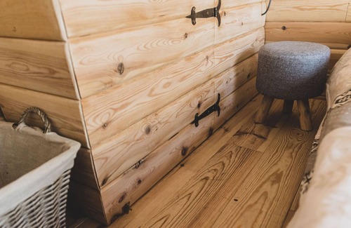 Layout: mezzanine: (bedroom(double bed(twin duvet, twin fitted sheet, 160 x 200 cm))) Log cabin: (Kitchenette(dining table(2 persons), electric kettle, toaster, cooker(2 ring stoves, ceramic), coffee machine, oven, fridge-freezer), sanitary facility(shower, washbasin, toilet), sauna, seating area(4 persons), shower, balcony or terrace) hot tub, sauna, heating, garden, garden furniture