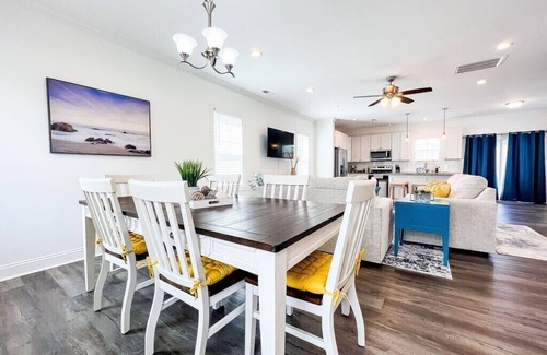 Between both units you'll have 2 kitchens, 2 dining rooms, and 2 living rooms, ensuring ample space for gatherings and making memories. Host with ease in these thoughtfully designed spaces! One home boasts bright blues, yellows, and light grays for a playful, lighthearted vibe. The other flaunts dark grays and vibrant corals for a modern, sleek look. Find the style that suits you!