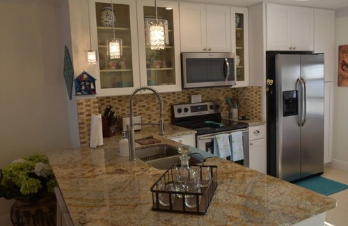 Newly remodeled oceanfront condo on penthouse floor (9th) with spectacular views. Direct ocean views from the living room and master bedroom. River views from the kitchen and second bedroom. Condo has been remodeled with high end baths and kitchen, floors. Full kitchen with all appliances. Kitchen is very well stocked with cutlery, dishes, wine glasses, pots and pans, blender, coffee maker, rice cooker.