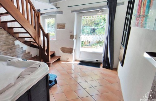 By pushing the door, you will discover, on the ground floor, your private jacuzzi as well as your bathroom and upstairs, your bedroom and living room.