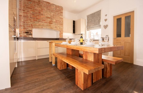 There is a large solid oak dining table with 2 benches on either side which seats 8 persons and a seat can be put at either end of the table to take seating to 10 persons. Butcher's block provides extra space for food prep.