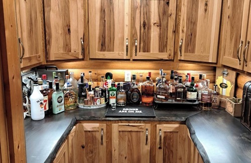 No indoor bathroom but there is an outhouse or just walk to cabin. With beds, couches, and air mattresses, you can easily sleep 16 people comfortably. The attached garage has chairs and couch with TV as well. The back pole shed is a hang out area with pool table, dart board, poker table, TV, popcorn machine and an additional bathroom. A patio door opens up to a beautiful outdoor sitting area with a firepit that goes directly down to the pond where you can enjoy floating or swimming. A large yard is also great for playing yard games and grilling out.