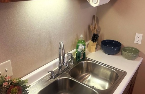 The ranch style home has an attached single car garage, plenty of space in the driveway for a couple vehicles and trailers. The interior is bright and spacious and has plenty of seating and room for up to 6 guests!