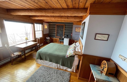 Cozy beachside studio overlooking Lake Superior sits right on the beach. Simple and charming room with log beams, wood floors and big views. Queen size bed looks out at the sun and moon rises, vanity, private bath with shower and toilet. There's a small refrigerator, microwave and coffee maker. Located right downtown Grand Marais, you can walk to all the restaurants for meals. Enjoy a beach fire in the evenings, or stream a movie on the free wi-fi. Basic accommodations, but you'll love the quaint charm and unparalleled location.