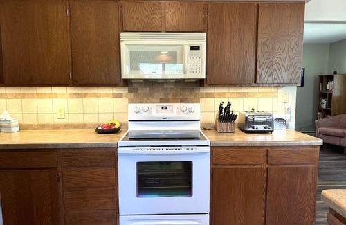 The home has 3 bedrooms each with queen beds, a full kitchen, dining table with seating for up to 10; comfortable living room with a 65" 4K HDTV and seating for 8. Head outside to play games or enjoy the fire pit in wooded rear yard. One bay of the garage is available for you to use to store bikes, skis, snowmobiles and other gear. The whole house was renovated in 2023, including new flooring. refrigerator, washer, and dryer.