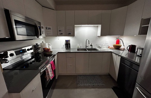 Brand-New and Well-Equipped: The unit is brand-new, providing a fresh and modern living environment. The kitchen is fully equipped with essential appliances including a full-size fridge, range, oven, microwave, and toaster. The convenience of a full-size washer and dryer is also available in the unit.