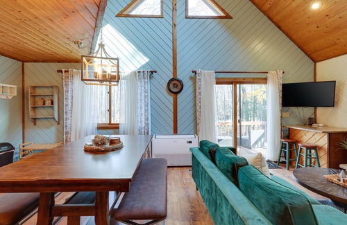 This ultra-cozy, renovated cabin is situated steps from Roamingwood Lake in the Hideout! Experience endless entertainment and relaxation with a comfy theater room, exciting game room, cozy reading loft, firepit, and more. Located in one of the most exclusive communities of the Poconos with tons of amenities. Loaded with elegant furnishings, wood accents, thoughtful touches, and air conditioning. Each bedroom is equipped with luxurious hotel-quality mattresses. You are sure to enjoy your stay!