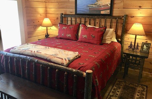 Fish Camp Lodge offers three spacious bedrooms, two bathrooms and comfortably sleeps six in bedrooms furnished with top-of-the-line comfortable beds. This cabin features a master suite with its own private bathroom with large tub and a shower; a second bedroom furnished with a Queen-size bed; and a third bedroom with two sets of twin-size bunk beds. All the Bedrooms have Flat Screen TV's with High Definition Cable.