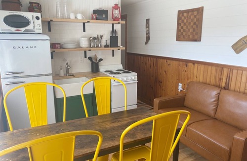 Gladstone Cabin #10 is named in honor of one of the towns that now lie at the bottom of the lake, the town of Gladstone. Years ago, this cabin was located at another resort down the water's edge from Niangua Hills Resort. The cabin was torn down and rebuilt on the new resort grounds and still features the original pine walls, which dates this structure to the area of it's time. This incredibly cozy cabin offers one of the best views of the lake from the resort. Enjoy having your coffee on the private deck each morning! Cabin #10 has been newly renovated and now features a new kitchenette with new appliances, a new bathroom with a beautiful tile shower, new floors, fresh paint, new bedding, new furniture throughout the cabin and the installation of an efficient mini-split air unit.