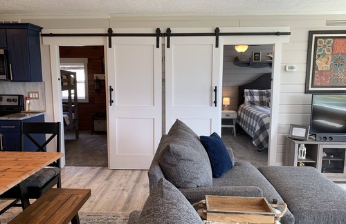 Inside our home you will appreciate how the primary bedroom (with a king mattress) and full bath are separated from the main living area for privacy and relaxation. The lakefront bedroom (queen mattress) with great water views, is an oasis of its own. Our 3rd bedroom with 2 bunk beds (containing 4 twin mattresses) allow this roomy home to easily sleep 6.