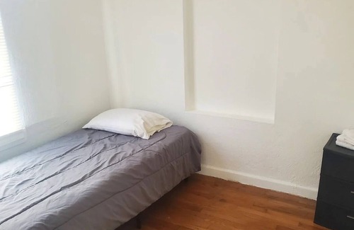 During your stay, you/your group get the entire home to yourself. This is NOT a shared space. Guests can access any part of the house except for one room, including the backyard (but not the unit in the backyard). One room has a queen size mattress, a closet, a large dresser and a small dresser. The other room has a twin size mattress and a small dresser. Between the two rooms sits an office space with a fireplace.