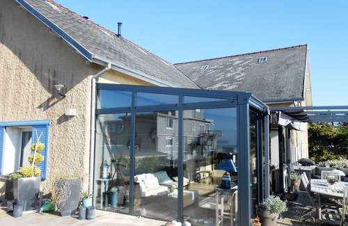 House of 300m2 with terrace in the south overlooking the islands Chausey and Granville 100m from the sea beach sand lounge outside dining area on terrace