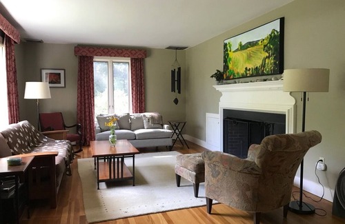 Lilac Hill offers a comfortable, one-floor house on a hill with the privacy of a secret garden and abutting conservation land with trails but only a 15-minute walk to Peterborough town center, whose amenities include restaurants, antiques & other shops, movie theater, bookstore, and more. Plentiful indoor and outdoor spaces, including open kitchen/dining room/living room with working fireplace, airy "Florida room," and large extra room with ping-pong table and third full bath. Private patio. Level 2 EV charger on premises. Close to Pack Monadnock and other great hiking opportunities.