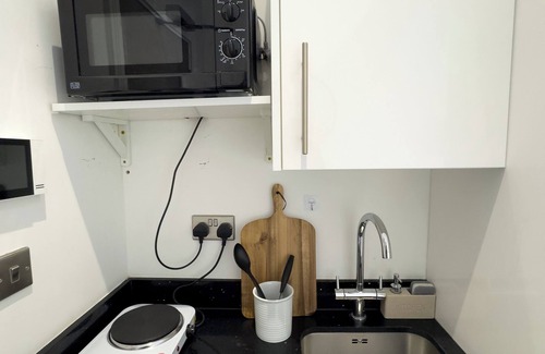 The Bedroom seamlessly merges with the living room area, a versatile space for laptop time and meals and The living room blends over to the kitchen area. Prepare yourself a delicious breakfast with our well-equipped kitchen. Cook with ease using our: