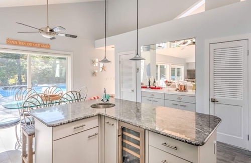 4BR/3.5BA w/ sun-lit vaulted living room with fireplace, large deck, outdoor heated pool, built-in stainless BBQ, and more!
