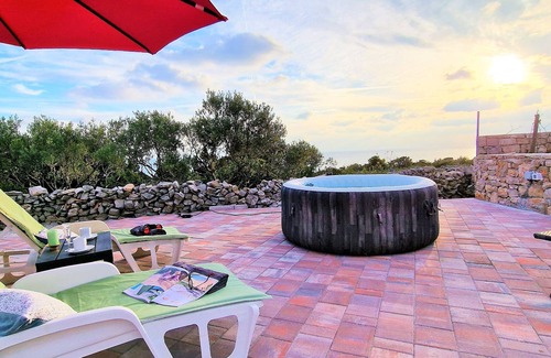 We are located in a pristine nature, above the cove of sandy beach and Cape Kalafate, so our property has spectacular open sea view; divine at dawn and sunset. Our property is a ground-floor house, fully equipped and air-conditioned, with a sunbathing terrace with a beautiful view of the sea and a jacuzzi for 4 people.