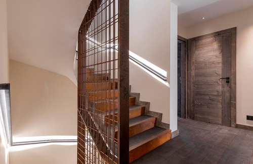 The interior of the residence is done in a chic alpine style with wood and contemporary materials such as glass, cobber and steel. The furniture selected by Nathalie de Breda mainly features French and European references and the wall covers and fabrics are all made by local artisans. The common areas of more than 400 m² includes a ski room, a swimming pool, a fitness room, a hammam and a massage room with a heated quartz sand massage bed.