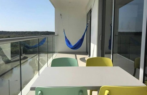 The apartment is located in one of the calmest neighbourhoods in Cartagena and boasts direct access to the beach. Perfect for a couple or a family of 4. It's just 10 minutes from the airport, 20 minutes from the historical city center. The condo has a gym, pools for adults and children, swimming lanes, a steam room, jacuzzis and a children's playground. From the balcony you can appreciate the sun rising behind several kilometers of green areas and canals. Space located in Serena del Mar, the dreamed city, a development complex consisting of 35 km of pedestrian paths and cycle routes, 4 km of beach, and various commercial spaces. The apartment is totally equipped with household appliances to make you feel at home. We provide additional conveniences like a hammock and televisions in both the bedroom and living room.