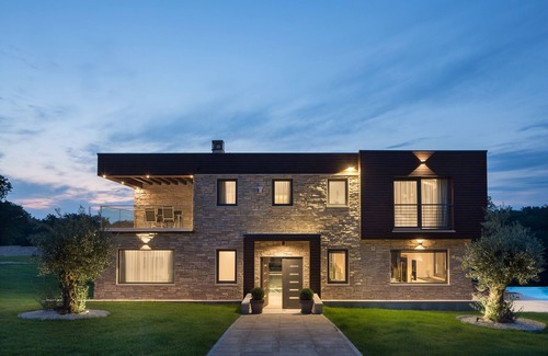 High-quality materials, soft tones, a tasteful decor: on this estate in the heart of Istria you will spend a heavenly time together with your loved ones. The two air-conditioned cottages for a total of 14 people offer first-class amenities. Seven bedrooms with large double beds are available. Each with its own en-suite luxury bathroom with floor-to-ceiling showers, double washrooms, contemporary tile and stylish design.