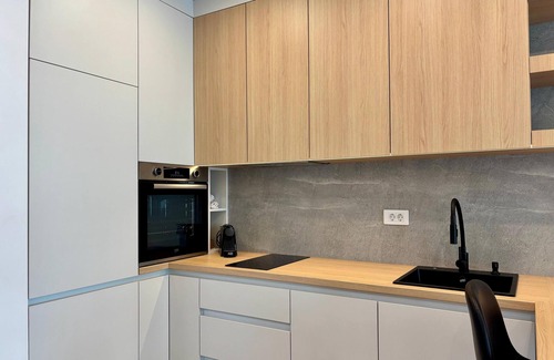The high-quality amenities leave nothing to be desired. The fully equipped kitchen features modern appliances, including a two-burner hob, a fridge with a freezer, a dishwasher, a Nespresso coffee machine, and other useful kitchen tools like a toaster, kettle, and tableware. Whether preparing a quick breakfast or a gourmet dinner, you'll find everything you need.