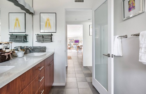 City ID #747 The Jacklin Ajemian"s Design House is a CONTEMPORARY 5 bedroom home is in one of Palm Springs' finest neighborhoods. This STUNNING home has ORIGINAL ARTWORK and the perfect place to create BEAUTIFUL MEMORIES that will last a LIFETIME! Fall in LOVE with our NEW saline, Pebble Tec pool, 8-person spa, a fire pit for cozy nights, or feel the MAGIC as the GLORIOUS mountains peer down upon you as you swim! Truly, a MAGICAL place to create EVERLASTING MEMORIES you will cherish for many years to come! This STUNNINGLY spectacular contemporary modern home offers 5 bedrooms and 3 bathrooms located in the desirable Deepwell area situated in south Palm Springs. The property is distinguished by more than two dozen palm trees and a citrus grove installed in the spring of 2011, giving the feeling of a true oasis. This home is wonderfully located for enjoying the Palm Springs shopping, golf, restaurants, and the popular Palm Canyon Drive downtown area. This well-designed Palm Springs home showcases the much sought-after "California Contemporary" lifestyle design. The bedrooms are nicely separated for your privacy. Plus, the spacious living area - that wraps around a large and attractive courtyard pool - provides 3,000 sq. ft. of indoor living space to enjoy. The open and welcoming "California style great room" includes the new kitchen that opens to the dining room and family room. This large multi-purpose room has a wall of glass that looks out onto the very private, large, beautiful new pool and spa and the spectacular mountain views. The main house has 5 large bedrooms and 3 bathrooms. In the main house, two of the master suites have their own private suite-style bathrooms, and one of the master bedrooms was updated in the summer of 2011 with a mini-refrigerator/freezer, microwave, and a wet bar. This spacious contemporary Palm Springs vacation rental was built to enjoy the sunshine and rest and relaxation inside the home and around the pool area. This Palm Springs vacation home offers a high-speed wireless Internet connection if you'd like to bring your laptop computers. Well-located on a quiet residential street in the desirable south Palm Springs neighborhood of Deepwell, this 5 bedroom holiday home is walled for privacy and is a wonderful private retreat. Bask in the sun-filled private backyard with a cold beverage on a comfortable chaise or enjoy a snack in the newly built shade porch with reading lights and ceiling fans. There is outside dining for 12, an in-ground jetted spa for eight, a beautiful outdoor shower, a hammock, and a well-spaced grilling area. The indoor dining area seats 12 comfortably and can be casual or elegant with very little effort. The kitchen is set up for those who enjoy a large and stylish updated kitchen with all the comforts and gourmet features. There is also seating for 6 to gather around the generous kitchen island. For those wanting to be "green" while on vacation, a new 52-panel state-of-the-art solar photovoltaic system is installed on the roof of the home. This Palm Springs vacation home is well located less than 5 minutes to downtown shops, great Palm Springs restaurants, and public and private Palm Springs golf courses. POOL HEAT FEES (October 1-Nov - December - January - February - March, April- May 15 ) to 83 degrees the following fee will be applied; *$75per day - LOWEST MARKET RATE IN PALM SPRING! * Pool Heat Charges tracked by Pentair Software program during your stay. * Pool heat invoice charges will be emailed to you a week before check-in. * Payment must be made before check-in. PETS No pets are allowed at this property. Make sure to book the Design House and EXPERIENCE the true ELEGANCE of Palm Springs!