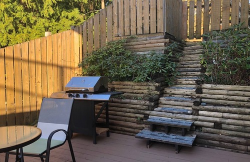 Executive suite for adults and families, stays cool all summer, warm in winter, comfy lounge area with TV & fireplace, full kitchen with a table for lovely family dinners, large bedrooms/comfy beds, remote work space, great Wi-Fi, private deck with BBQ/distant water view, amenities such as shopping and eating out are nearby, and 8 walking beaches are nearby. (plus Parksville white sand beach). Week and month stays welcome (washer/dryer available for longer stays). Besides being perfect for working from home, our suite is also central and accessible for skiing, surfing and sightseeing.