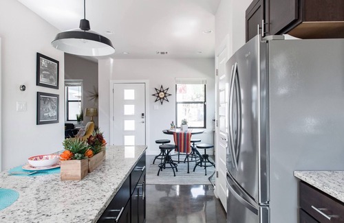 Enter this newly built home and marvel at the charming local décor, high ceilings and beautiful spacious rooms! Rest your tired legs on the sofa or armchairs as you watch the flat-screen TV in the living room. Relax on the back terrace and fenced-in lawn, or sit on the front porch and chat with the friendly local neighbors. Talk about the fun plans you have for your San Antonio stay over breakfast at the kitchen island or dining table. Walk to the Dignowity Hill Farmers Market just blocks away, go have a fantastic coffee at Estate, or go to enjoy a delicious meal or a drink at Dignowity Meats. Whip up a tasty snack in the kitchen with new stainless-steel appliances. Rent bikes and go for a ride to Hays Bridge to watch the stunning sunset over the magnificent view. As the day comes to a close, retire to the cozy bedrooms for a night's sleep.