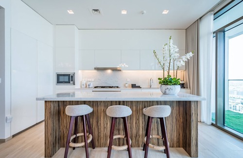 Escape to serenity in this exquisite 3-bedroom residence at Palace Residences, Creek Harbour. This splendid apartment features an inviting living area furnished with a cozy sofa set and a smart TV. The open kitchen is a chef's delight, while the six-seater dining table is perfect for gathering with loved ones. With two king-sized beds and two single beds across the three bedrooms, this property guarantees a restful night’s sleep.