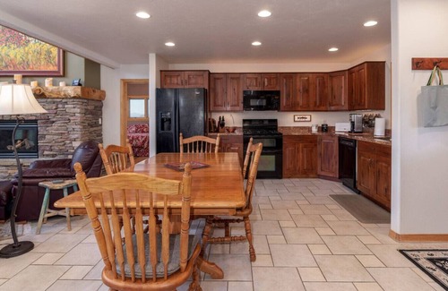 Inside, you will find a large living area with huge great room windows and a cozy gas stone fireplace. The main floor Master offers a king bed, in floor heat, hickory floors and a private master bath. A half bath on the main level is available for guests. Upstairs, two large rooms. One with spectacular views and a king bed and a bunk room with 2 twins and one queen bed and share a bathroom.