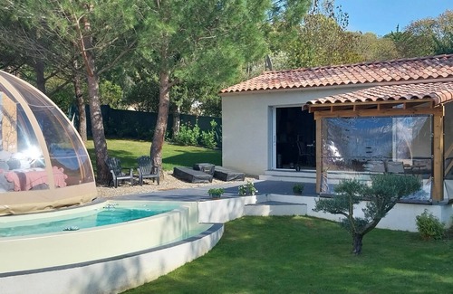 "F"anny Wigwam 26m2 and 50m2 relaxation area is located in Malves-en-Minervois. "F"anny Wigwam 26m2 and 50m2 relaxation area provides accommodation, featuring Fireplace/Heating, Hot Tub, Laundry, among other amenities. This Cabin features Fireplace/Heating, Hot Tub, Laundry, to make your stay a comfortable one.