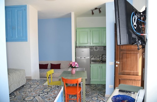 comfortable studio apartment, just renovated, very refined in the choice of materials and furnishings, designed to accommodate 3 people (1 couple + 1 single). There is 1 sofa bed for one and a half and 1 single sofa bed. The furniture also consists of a kitchenette and a dining area - TV, functional and complete with all accessories. The luxurious bathroom also has a washing machine and water tank