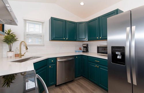 This home has an open floor plan with a master ensuite (with a full bathroom) on one side of the home. The master has a queen bed and a television as well as a walk-in closet. The living room separates this area from the other two bedrooms and full bathroom. The living room has a memory foam queen sleeper sofa and a 65 inch tv. The two bedrooms on the north end of the home each have queen beds and televisions. Every bedroom is equipped with a white noise machine for guests comfort. The home also has a full- size washer and dryer with All Free Clear Pods and Bounce Free dryer sheets provided. The backyard is privacy fenced (not secured with gates) and has an outdoor dining set with umbrella, extra chairs, and stainless steel propane grill for use.