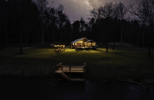 Come stay at The Rustic Ruby and get away from it all. Relax in the 4-person hot tub on a screened in deck. Enjoy roasting marshmallows or hot dogs in the custom fire pit. Sip coffee on the dock and listen to the sounds of nature all around you. Play some cornhole or throw a line in the water and catch some fish. We have bass, trout, catfish, and bluegill. Maybe you'll get to see the ducks as they visit throughout the year.