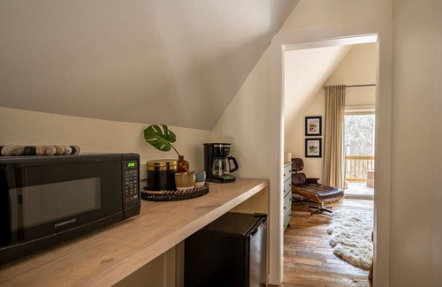 Our amply-stocked kitchen is the heart of the cabin, offering a suite of culinary tools including a mixer, blender, waffle maker, and both French press and standard coffee makers. Organic coffee, & teas are provided, as well as basic spices. The space is equipped with essentials to serve up to twelve guests. Our dining area accommodates ten people comfortably, with additional seating at the kitchen island.