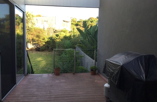 Bright and breezy house with ocean views in quiet cul-de-sac. Open plan upstairs with living, kitchen, main bedroom and rear north facing deck. Balcony with ocean views overlooking treetops, sliding doors at each end of the house allow afternoon sea breezes to flow through. Dine inside or enjoy a BBQ on the deck.