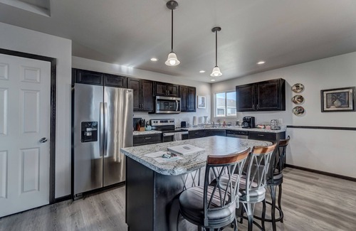 4 bedroom 2 bath with a 3 car garage, built in 2021, in a subdivision overlooking Rapid City with great views of sunsets over the Black Hills during evening walks in the neighborhood. The four bedrooms have one king, two queen, and two twin/twin bunk beds. Game room with foosball, air hockey, & games along with large HDTV's with access to all your streaming networks through high speed internet provided.