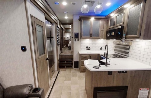 5th wheel toy hauler with 2 separate bedrooms, 1.5 baths, full kitchen, large couch, 3 TVs, dining table, 2 outdoor awnings, and an outdoor kitchen!