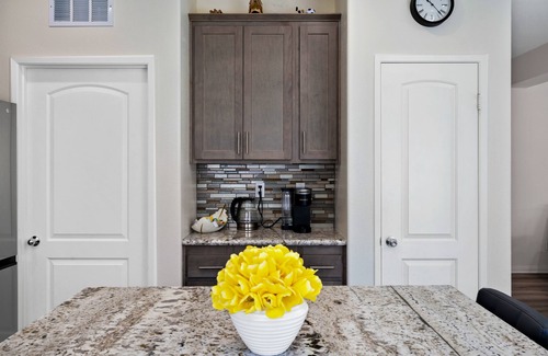 Desert Retreat is a beautiful 4 bedrooms with comfortable sleeping arrangements that all guest have a restful sleep. Each bedroom is elegantly furnished with plush bedding and the master suit with 65 inch tv, master bathroom features a soaking tub. Dessert Retreat has 3 full bathrooms. The house has dining area for 10, with outdoor kitchen w/ gas grill. Endless entertainment awaits soccer field, ping pong table. Enjoy the amazing view of the mountain all around Desert Retreat.