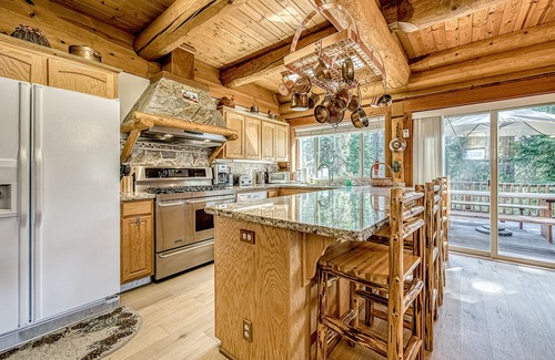 Inside this spacious log cabin-style home, you'll find a full kitchen, complete with a dining area. Four TVs, a DVD player, and free WiFi will make sure you're connected during your stay. Up to 14 guests and 4 dogs can sleep here, so bring the whole family along!