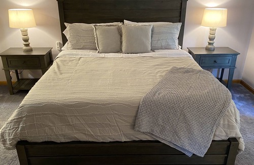 The master bedroom is located on the main floor and features a king size bed, Smart Fire TV, adjoining bathrooms with whirlpool tub and separate shower. From the bedroom, sliding glass doors open to the large sun deck overlooking the backyard and lake.