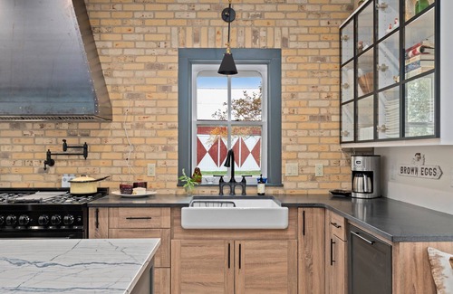 Historic 100+ year old brick farmhouse, built with iconic cream city brick, updated and modern while still retaining its unique country charm. With first floor primary bedroom and ensuite bath and four additional bedrooms, two full bathrooms, and laundry room on second level, the house can easily accommodate several families, multi-generational families, friend groups, or work retreats. This American hobby farm guesthouse has original millwork and hard maple flooring. The covered entry porch is always a cool respite from the afternoon sun. The newly renovated gourmet kitchen is a chef's dream, and the adjoining wet bar and sitting area make this space the ultimate gathering space for a quaint evening at home. The living room gas fireplace takes away the chill from skiing in the nearby Kettle Moraine State Forest.