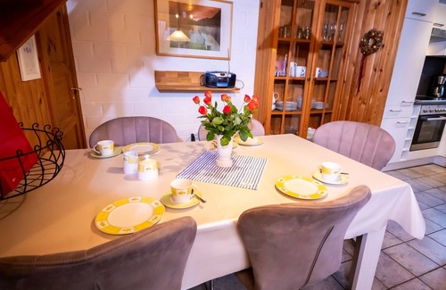 4-room semi-detached house 70 m2 on 2 levels, on the ground floor. Living/dining room with Scandinavian wood stove and satellite TV (flat screen), radio and DVD. Exit to the garden, to the terrace. 1 room with 1 double bed (160 cm, length 200 cm). Kitchenette (oven, dishwasher, 4 ceramic glass hob hotplates, microwave, electric coffee machine). Shower/WC. Upper floor: 1 room with sloping ceilings, without wardrobe with 1 bed. 1 double bedroom with sloping ceilings, without wardrobe. Electric heating. Terrace partly roofed. Terrace furniture, deck chairs (2), box-room. Facilities: sauna, iron, children's high chair, logs (extra). Internet (WiFi, free). Please note: non-smoking house. Maximum 2 small pets/ dogs allowed. The shared wardrobe for the single- and double room is located on the corridor on the upper floor. Living-/dining room with underfloor heating. Bathroom with underfloor heating and access to the sauna. 1 reserved parking space 20m from the house. Bookings accepted for holiday purposes only.