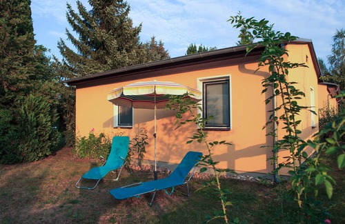 The approx. 35 square metre non-smoking bungalow is equipped with a combined living and sleeping area (couch, a 1.40 m double bed, flat-screen TV, radio), a kitchen (electric cooker with oven, fridge with freezer compartment, dining area, various small kitchen appliances), a bathroom (shower/WC, electric towel warmer/heater, hairdryer) as well as electric heating and insect screens on the windows. There is also a terrace, a bicycle storage room, parking spaces and free WLAN.